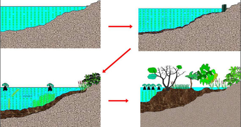 Outra alteração causada pelas plantas aquáticas, é o assoreamento das margens dos rios, lagoas e represas, como podemos ver na imagem abaixo. O material orgânico nelas liberados e suas raízes fazem com que a terra entre cada vez mais para dentro do ambiente aquático.